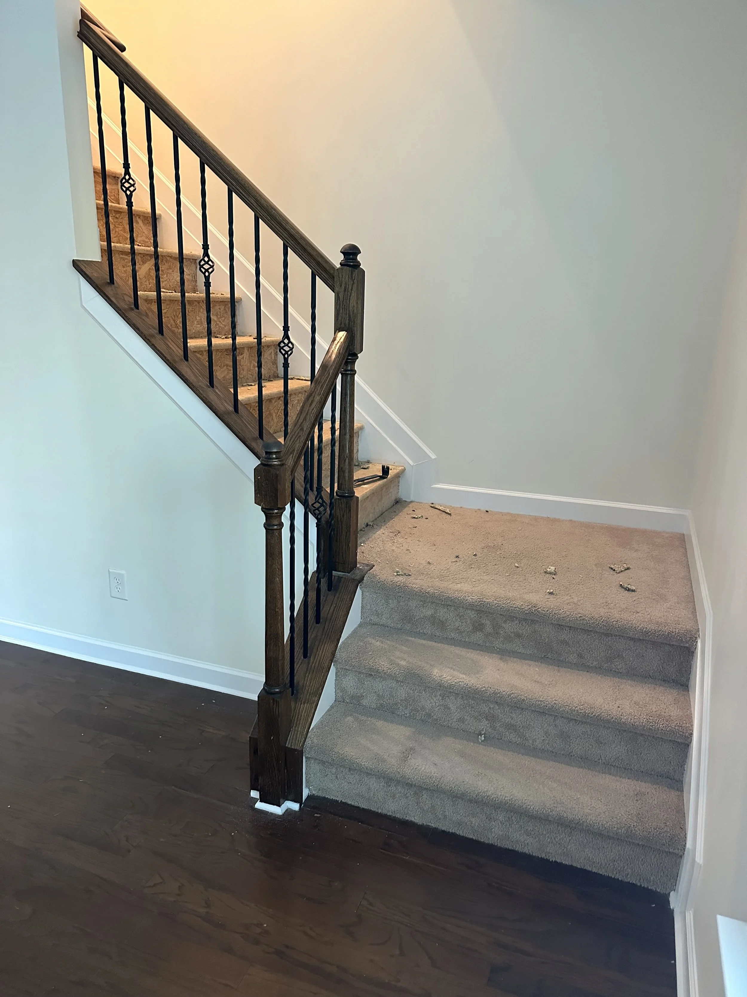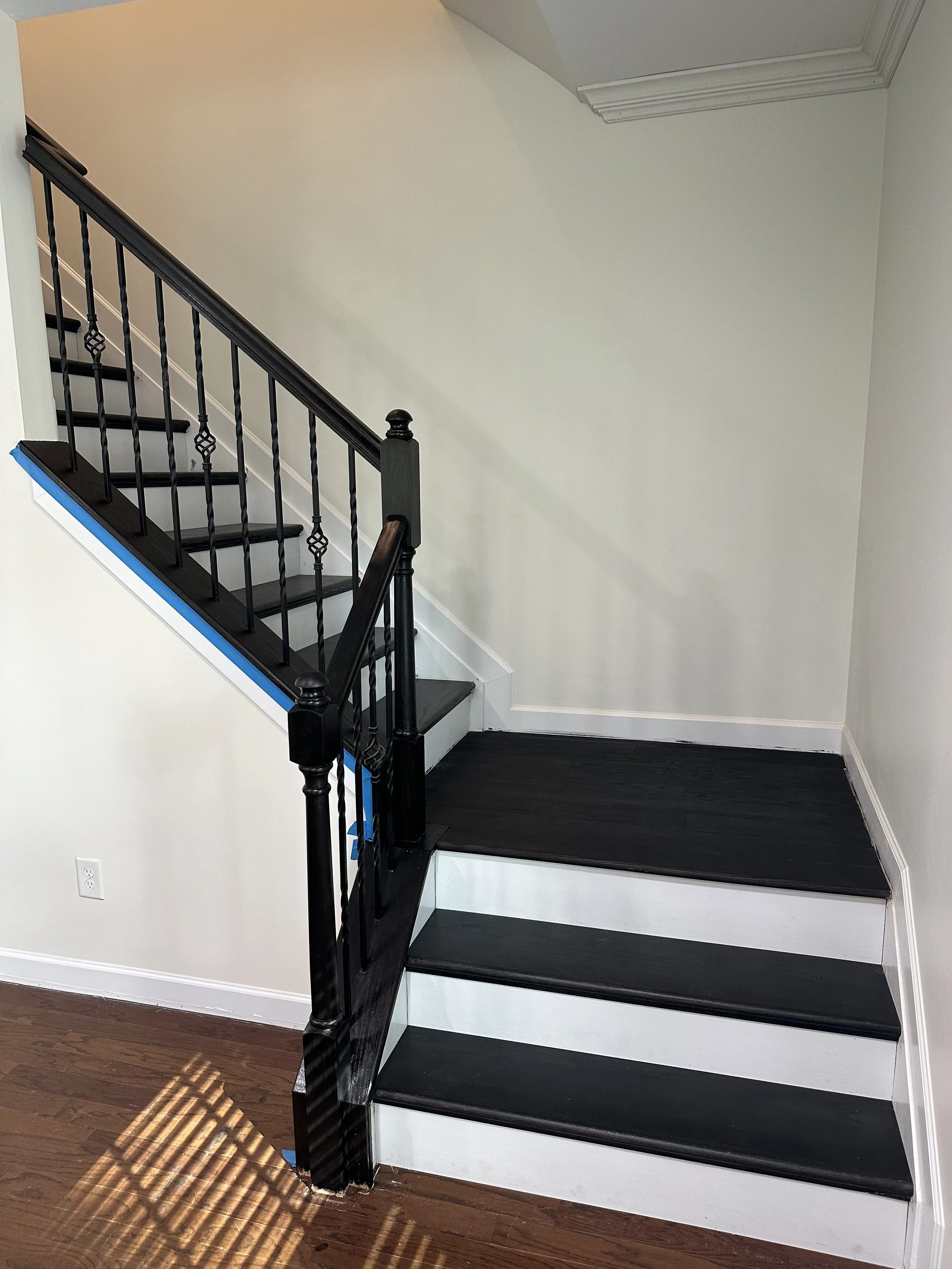 Staircase demo: Installed new white risers with solid oak threads. Stain color "true black"