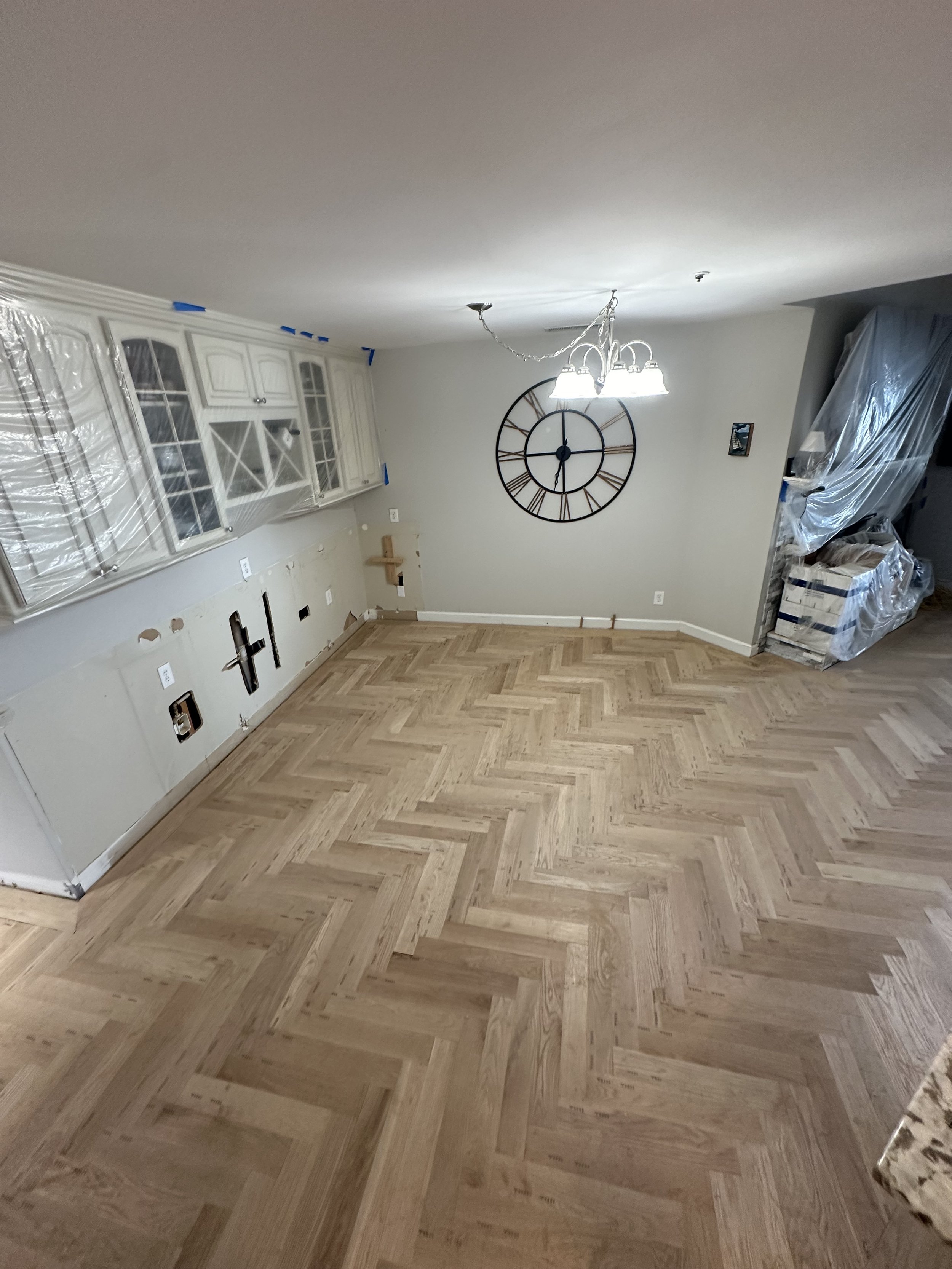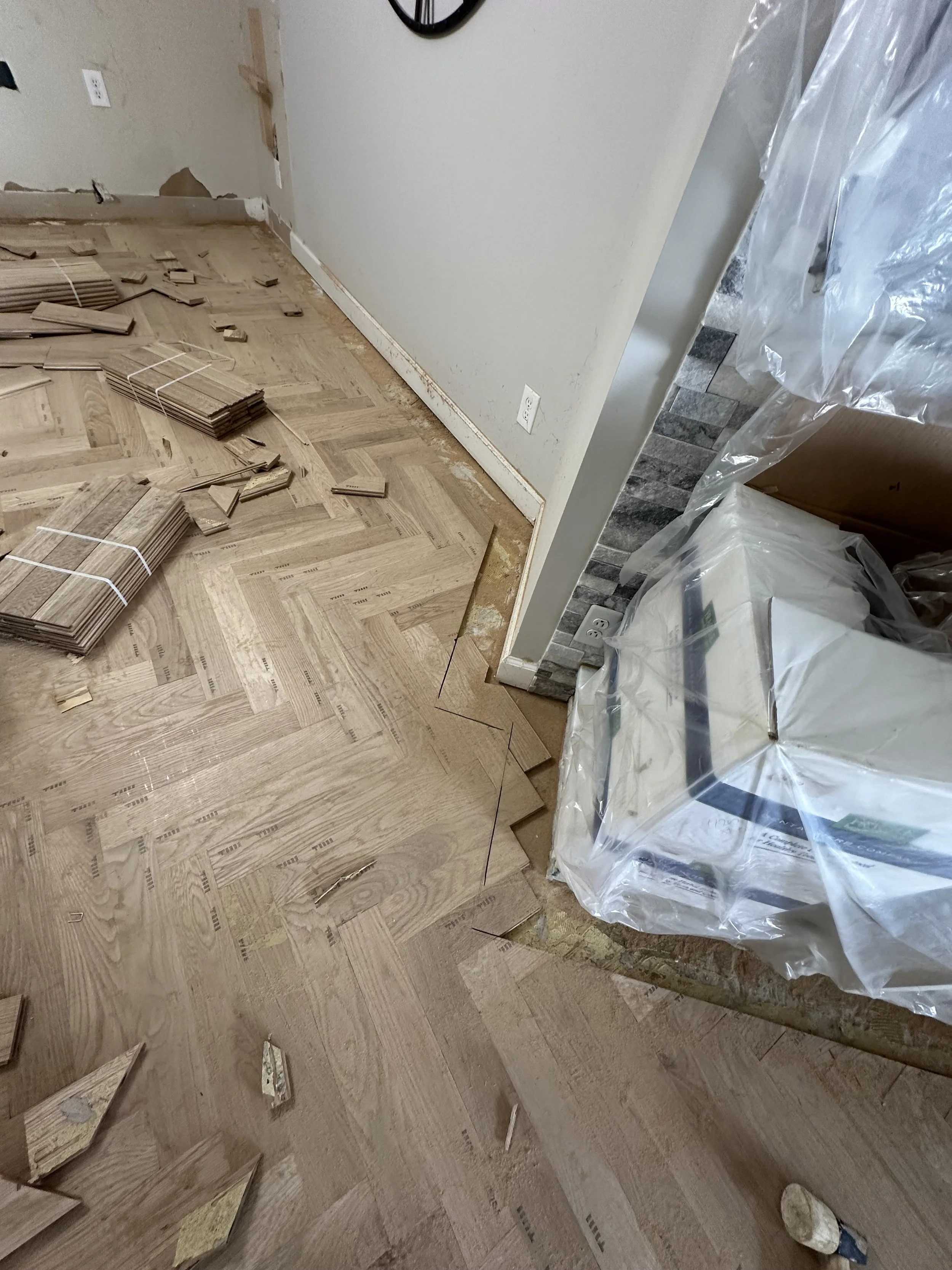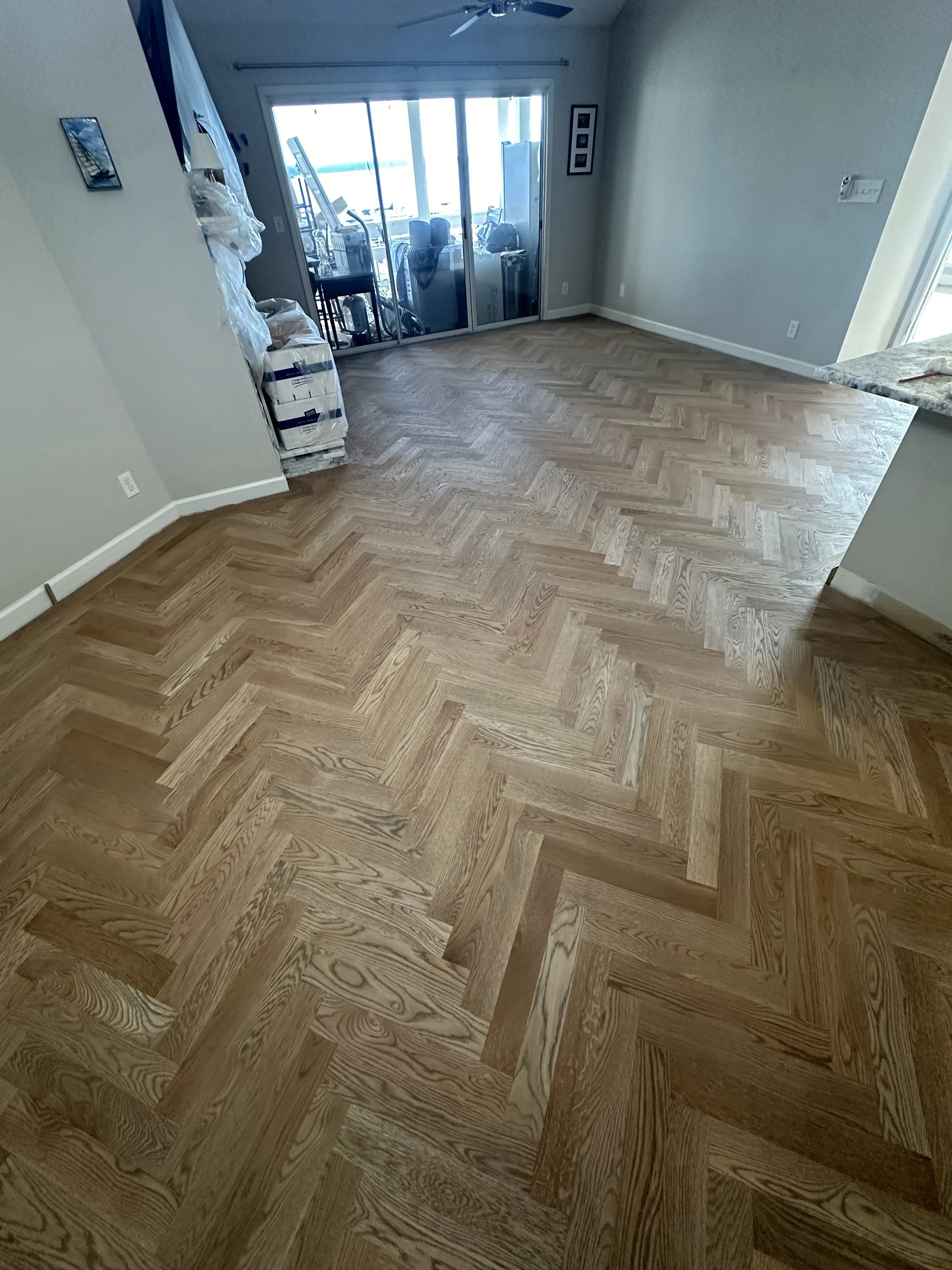 Solution: Installed a 3” white oak herringbone design with 5” borders throughout, weathered oak stain and bona mega water-based finish.